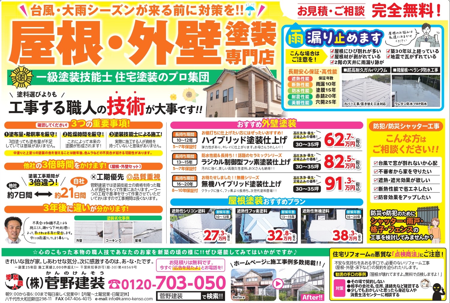 「以前の工事で、よくわからないまま業者に任せてしまった」「見積書を見て『こんなにかかるの!?』と驚いたが何も言えなかった」などの悲しい声を聞くことがあり、なんとも悔しい思いになります。菅野建装では、そのような思いはさせません。